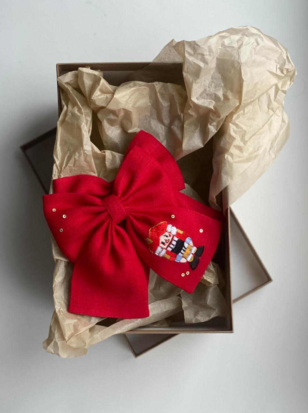 Невероятно праздничный и очень красивый льняной бант станет прекрасным дополнением к новогоднему наряду. Примерный размер готового банта: ширина 11 см / длина 13 см